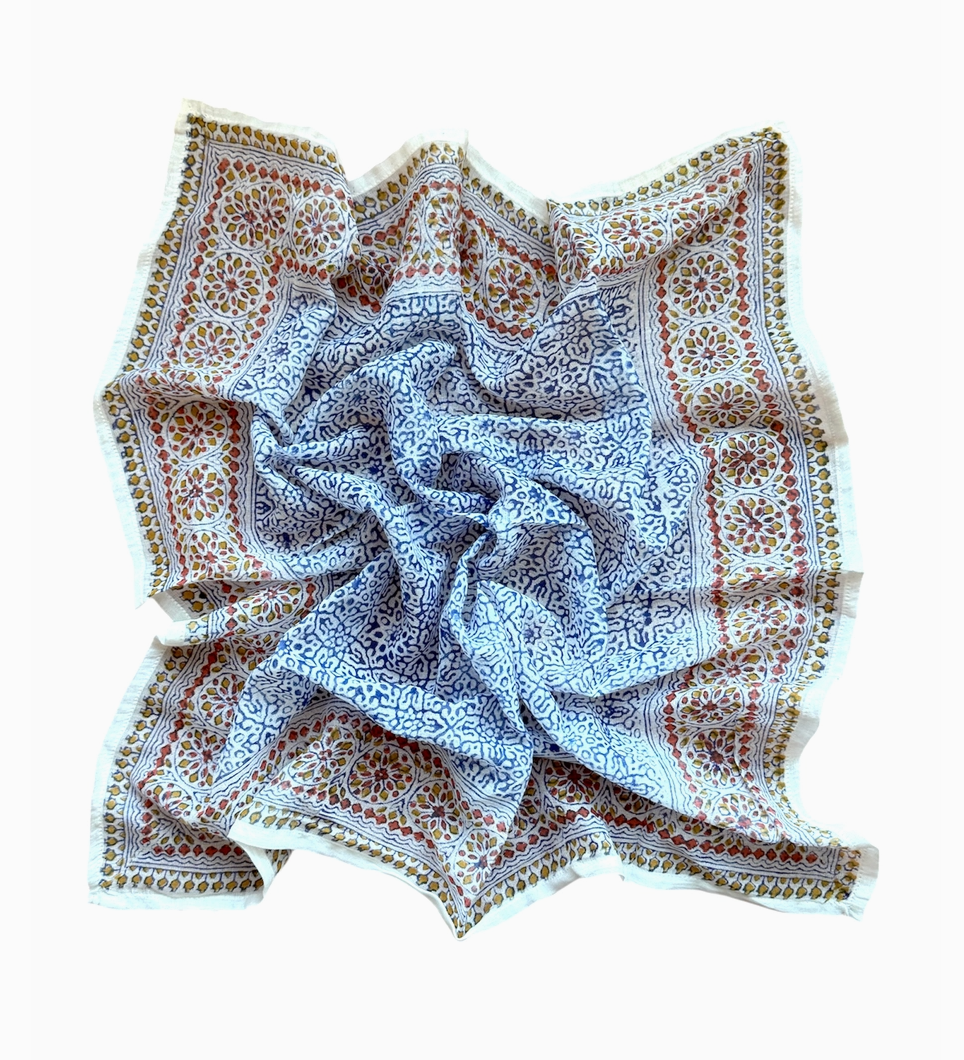 Give your closet a Spanish spin with our Granada bandana, inspired by the warmth of the Mediterranean waters and the golden glow of Granada's landscape. Bright blues, shiny yellows, warm terracottas—a go-to palette to turn your gloomy winter pieces into a summer-escape-worthy wardrobe.